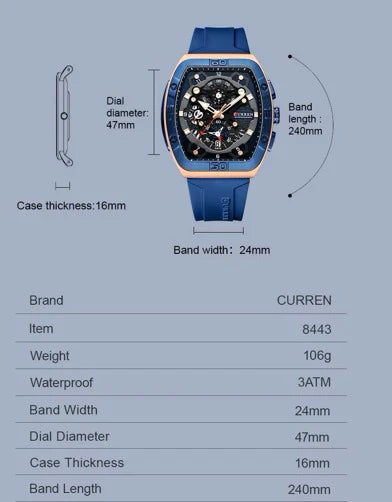 CURREN 8443 Original Brand Rubber Straps Wrist Watch For Men