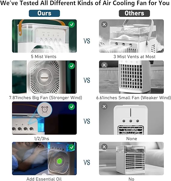 - 【VERSATILE & PORTABLE】Add in 700ml tap water and ice cube, the portable fans that blow cold air can work for over 12hs. You can also set timer from 1-3hs to meet your demands. 7 colors night light