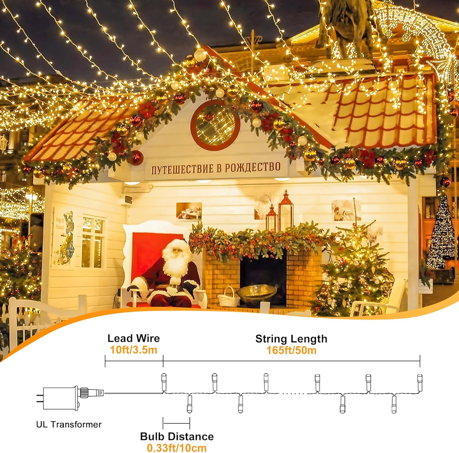 - Same quality and length with better price:Come on a storage wheel withUL Safe Plug powered 165ft/50m long wire with 500 led lights, can be decorated in dark coners, living room or around a tree in yard.The distance between bulbs is about 0.33ft/10cm.